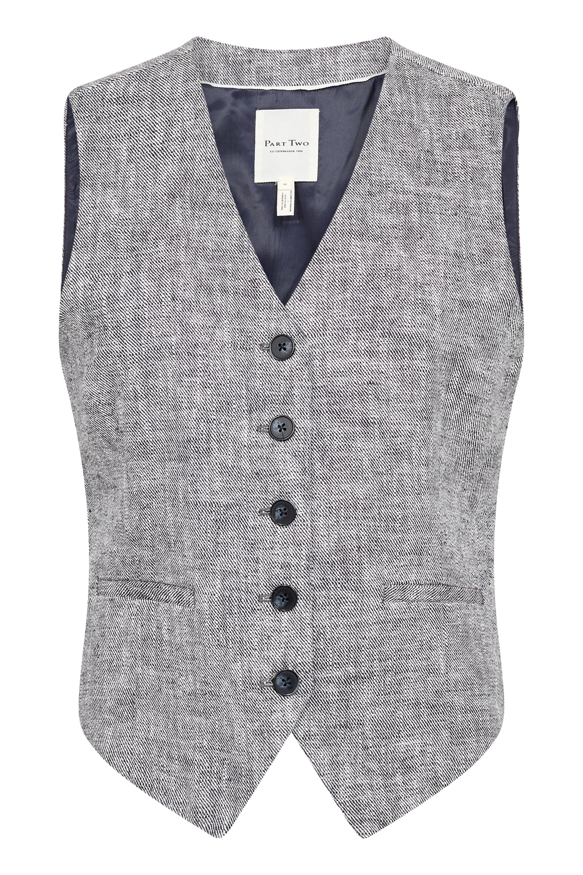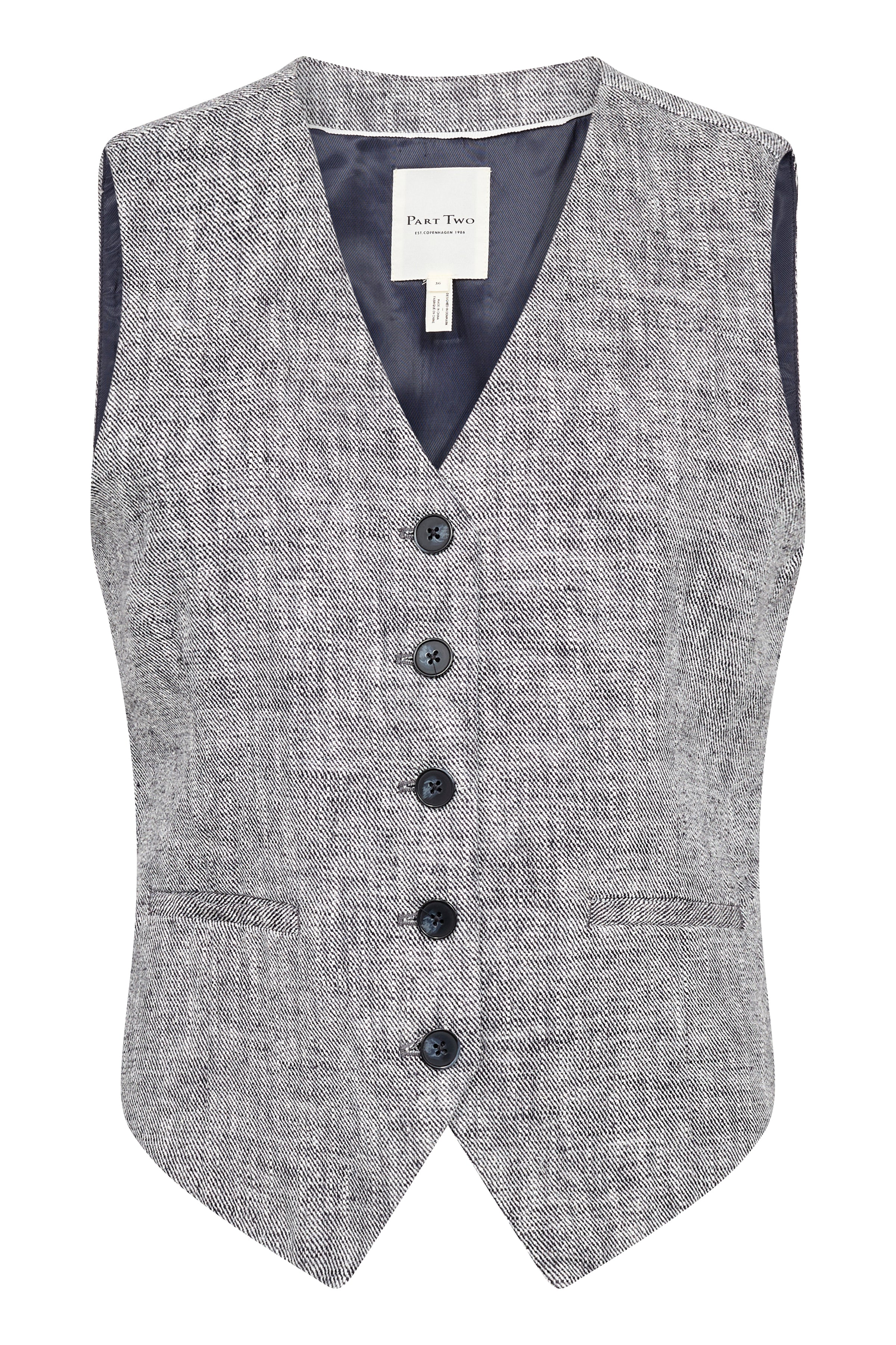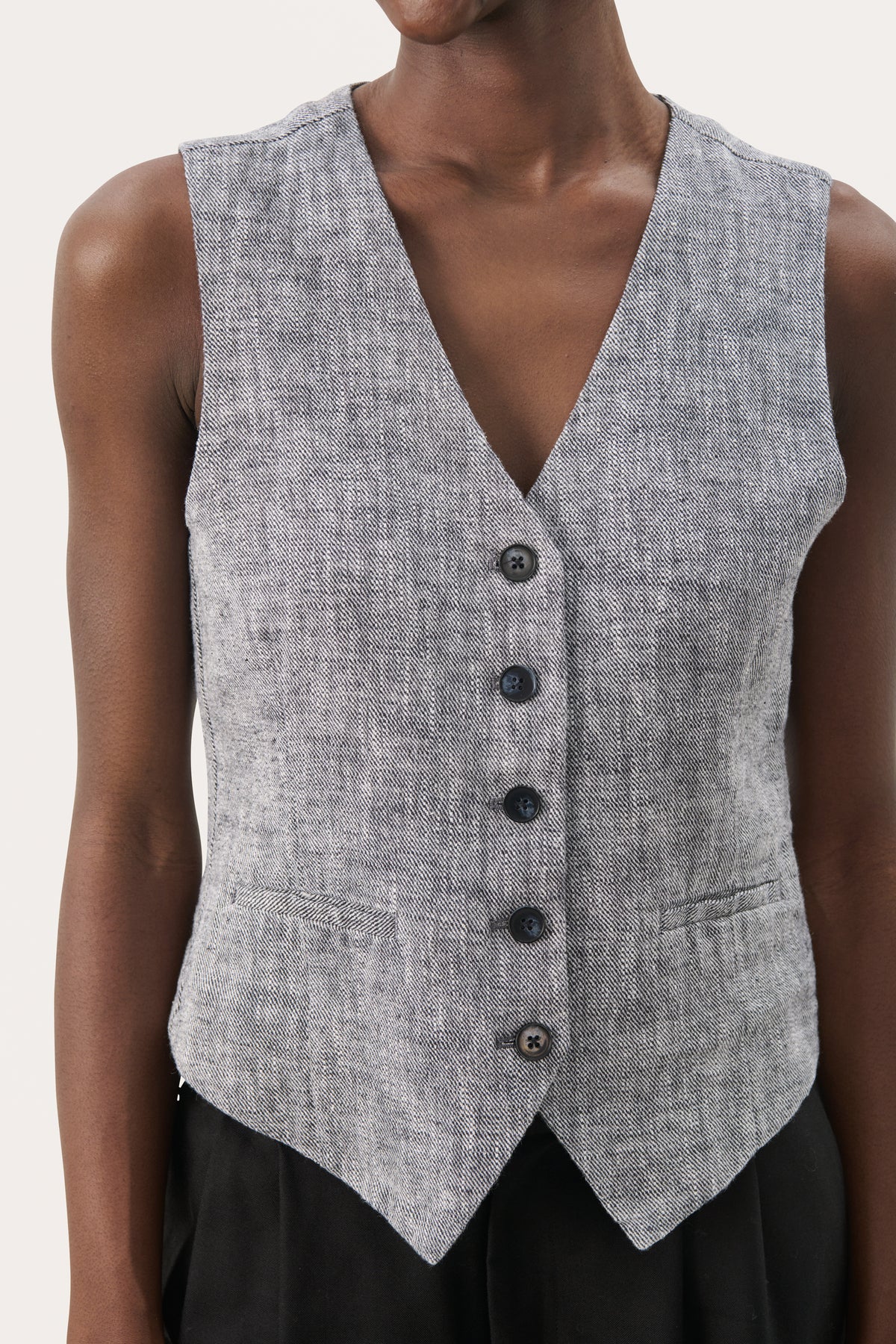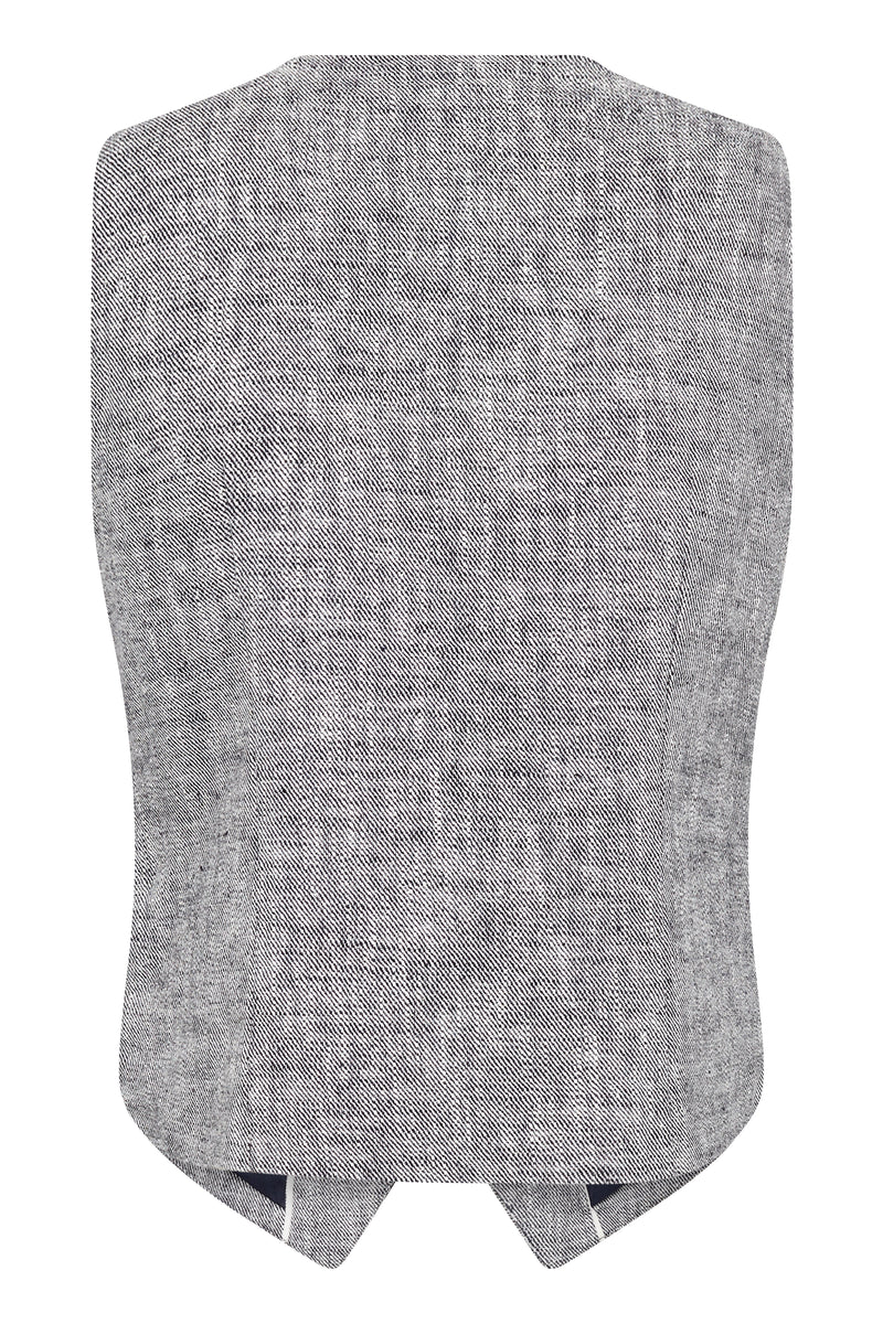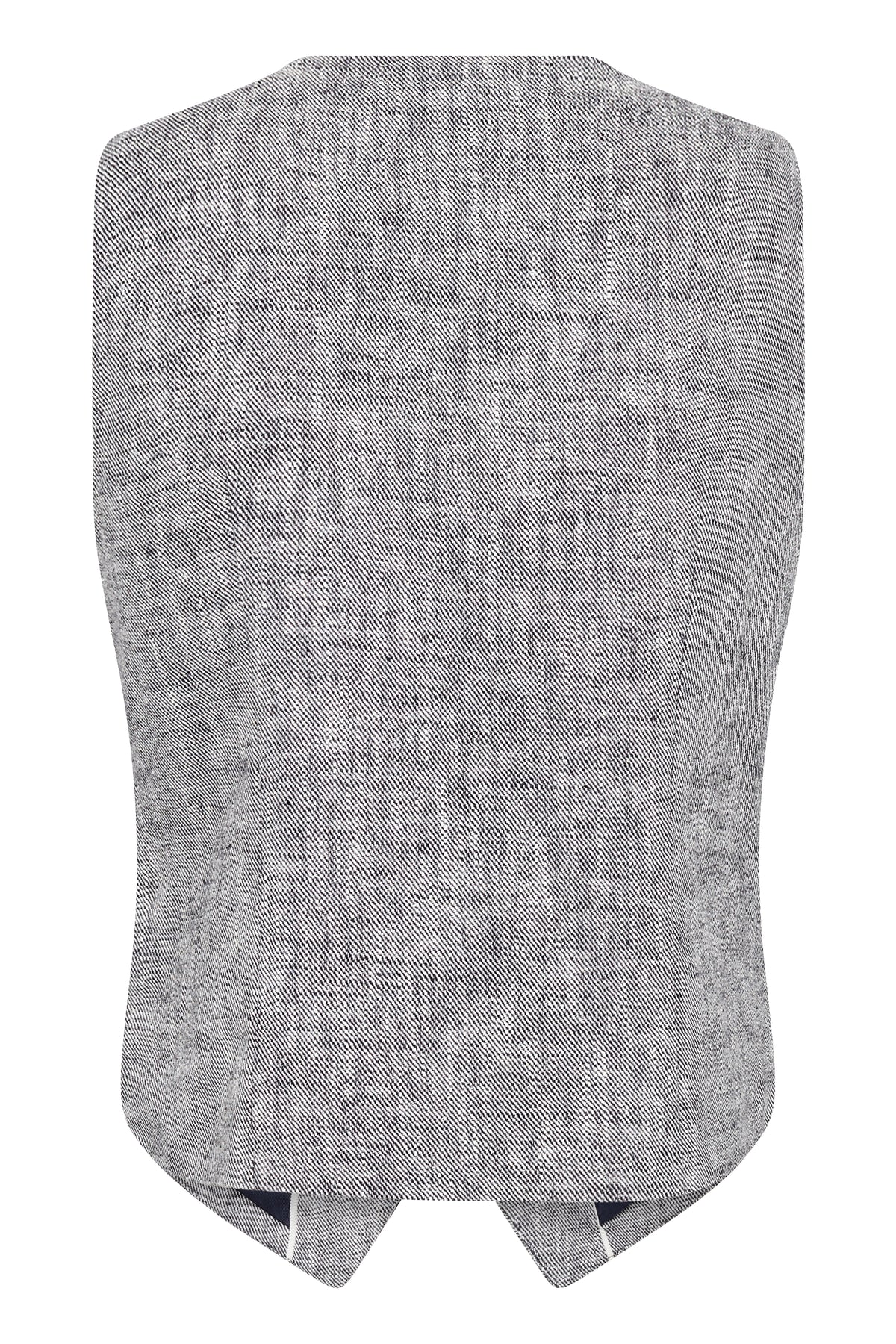 The model is 176 cm tall and is wearing a size 36. This classic waistcoat in a light linen blend exudes timeless elegance. Featuring a deep V-neckline and button closure, it’s perfect for layering. Pair it with matching trousers or a lightweight shirt for a stylish outfit.