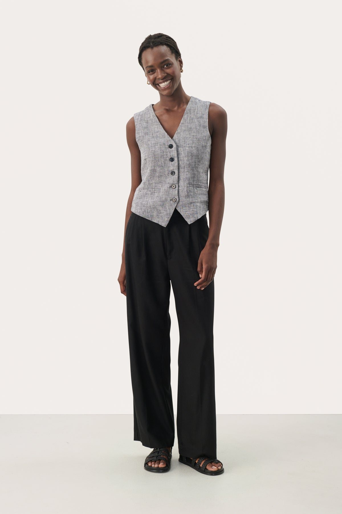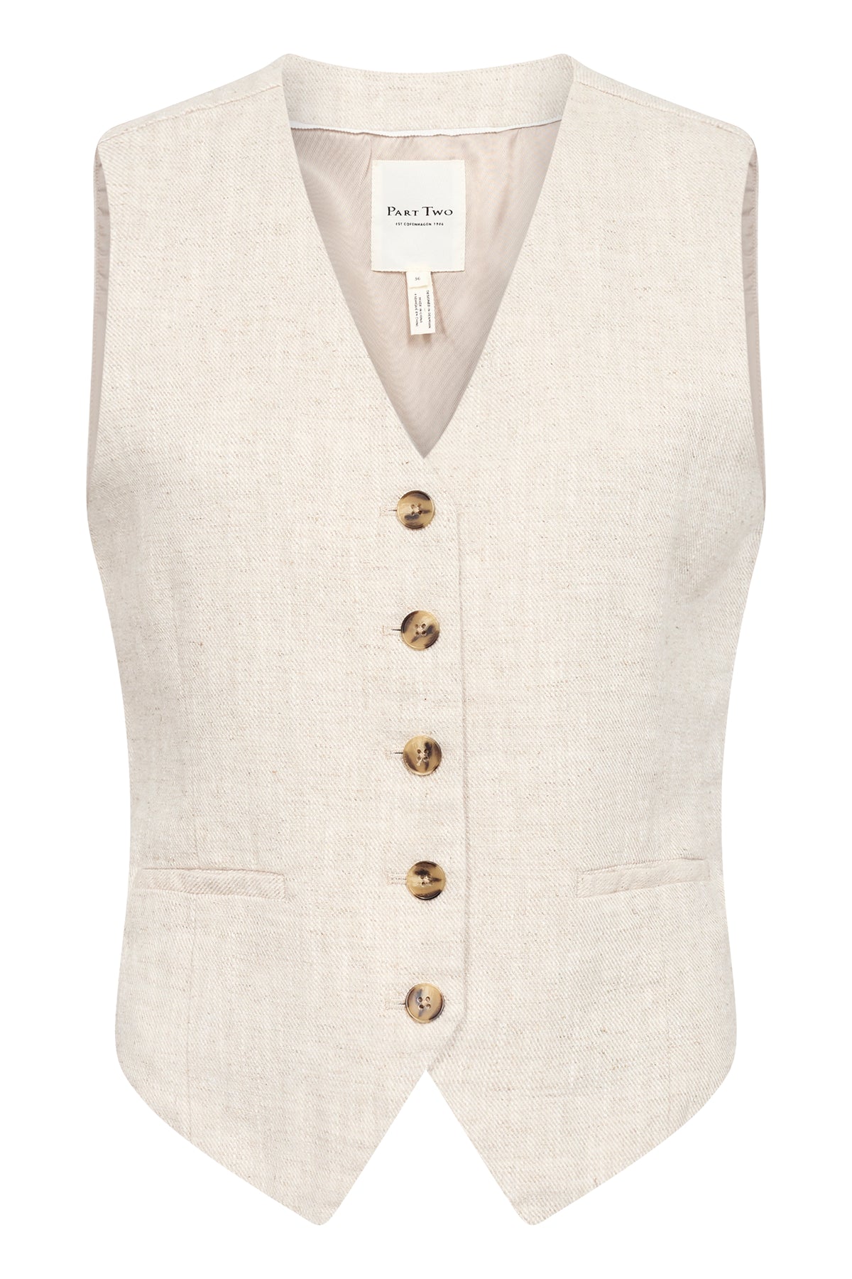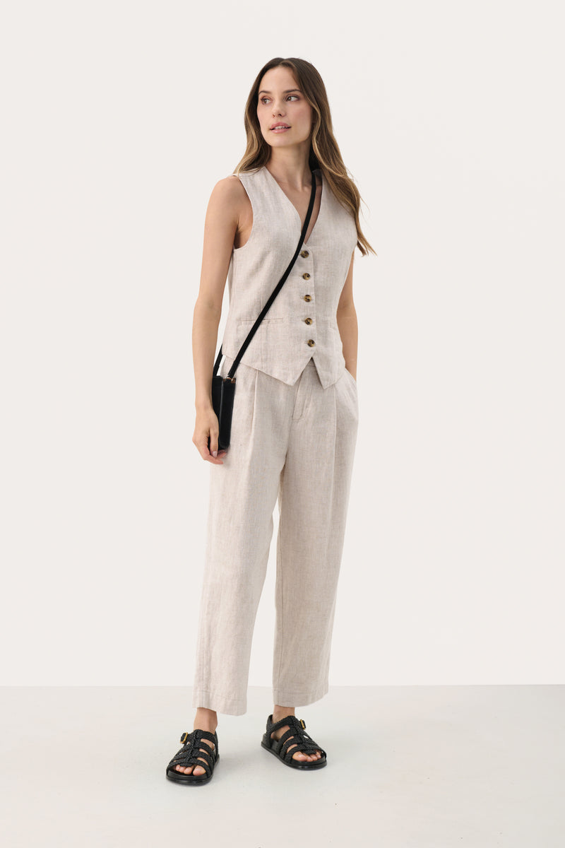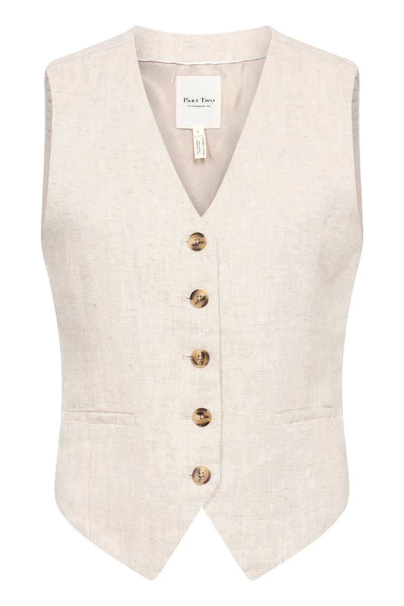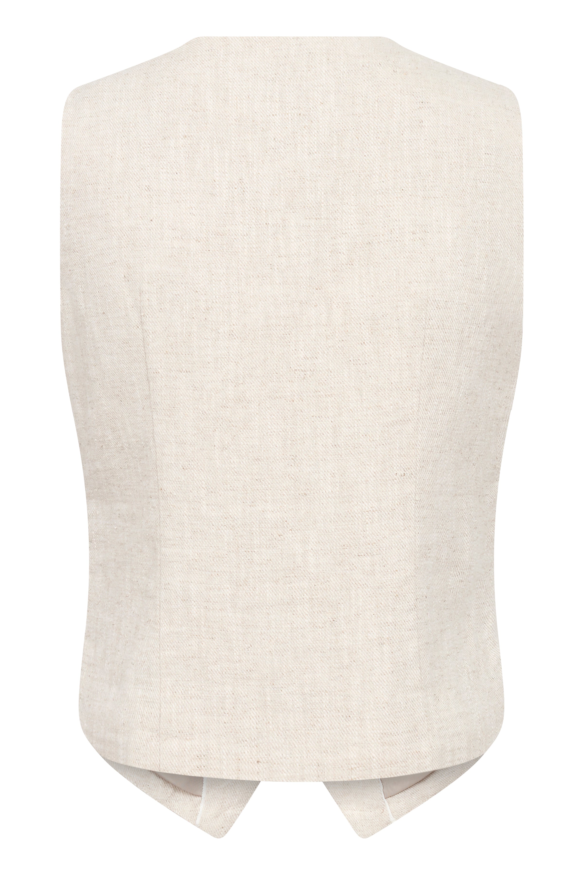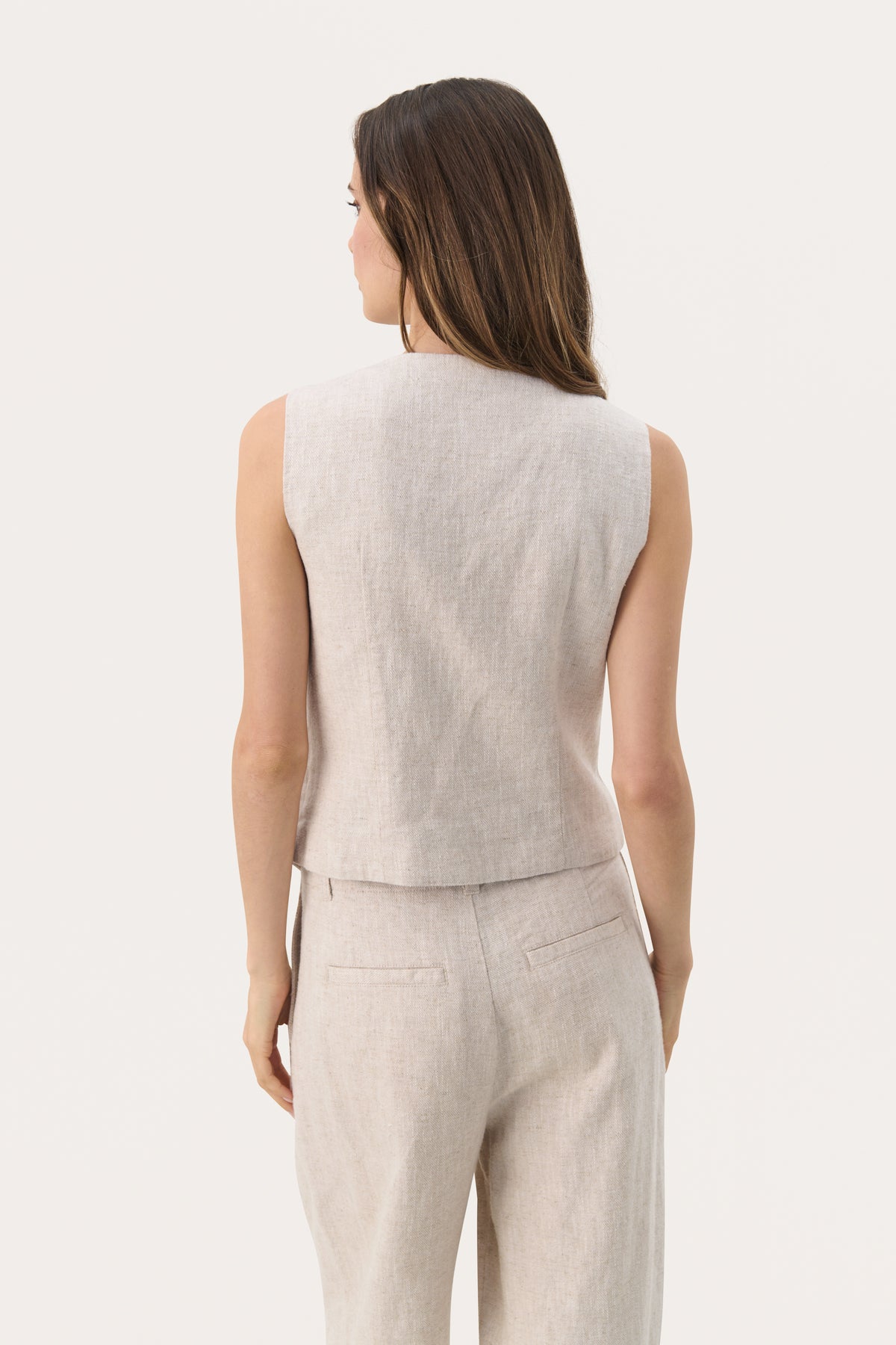 The model is 176 cm tall and is wearing a size 36. This classic waistcoat in a light linen blend exudes timeless elegance. Featuring a deep V-neckline and button closure, it’s perfect for layering. Pair it with matching trousers or a lightweight shirt for a stylish outfit.