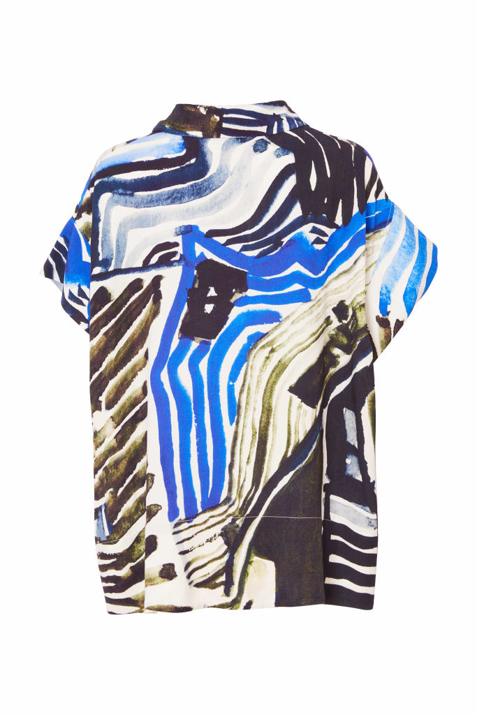 RELAXED GLAMOUR; ORA have brought the short sleeved shirt blouse right up-to-date with a bold but beautiful print. The clever colour mix ensures you have a style to lean on all summer long.