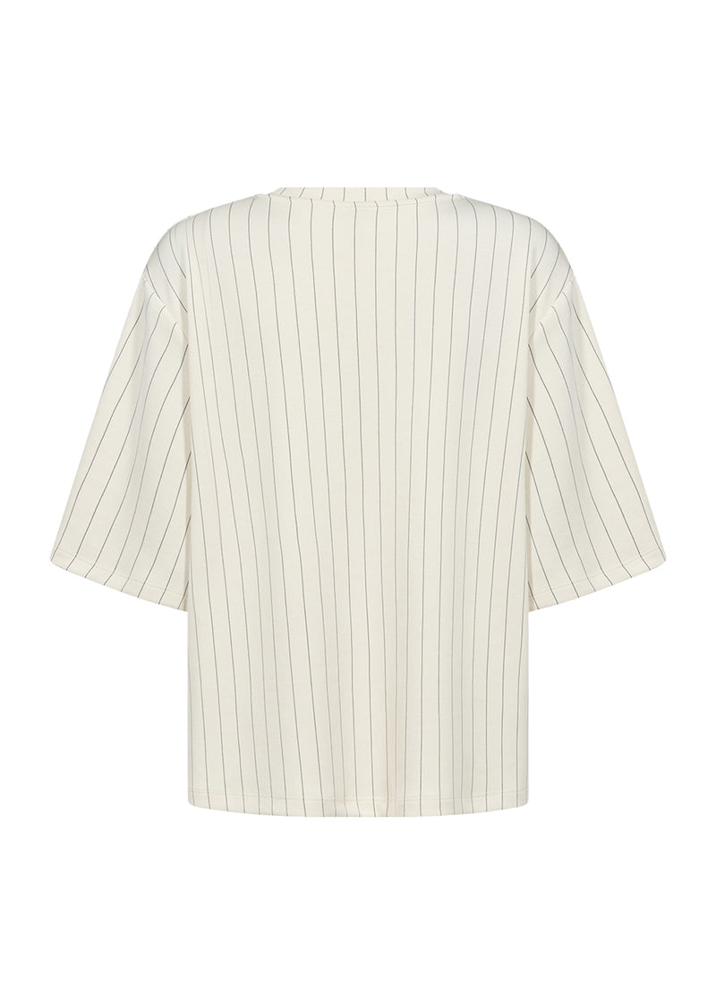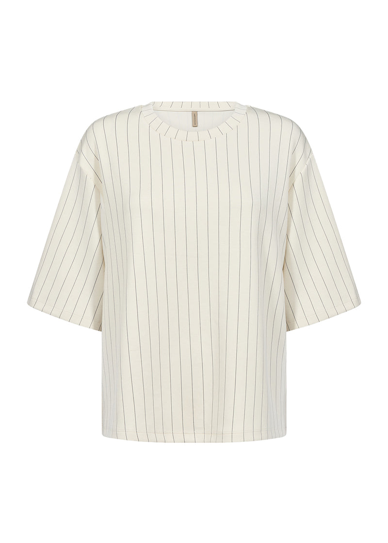 SC-SIRI 1 is a T-shirt made from 48% Modal, 48% Polyester, and 4% Elastane. It features a classic round neck, three-quarter sleeves, and a clean vertical stripe design. Pair it with tailored trousers or denim for a stylish look.